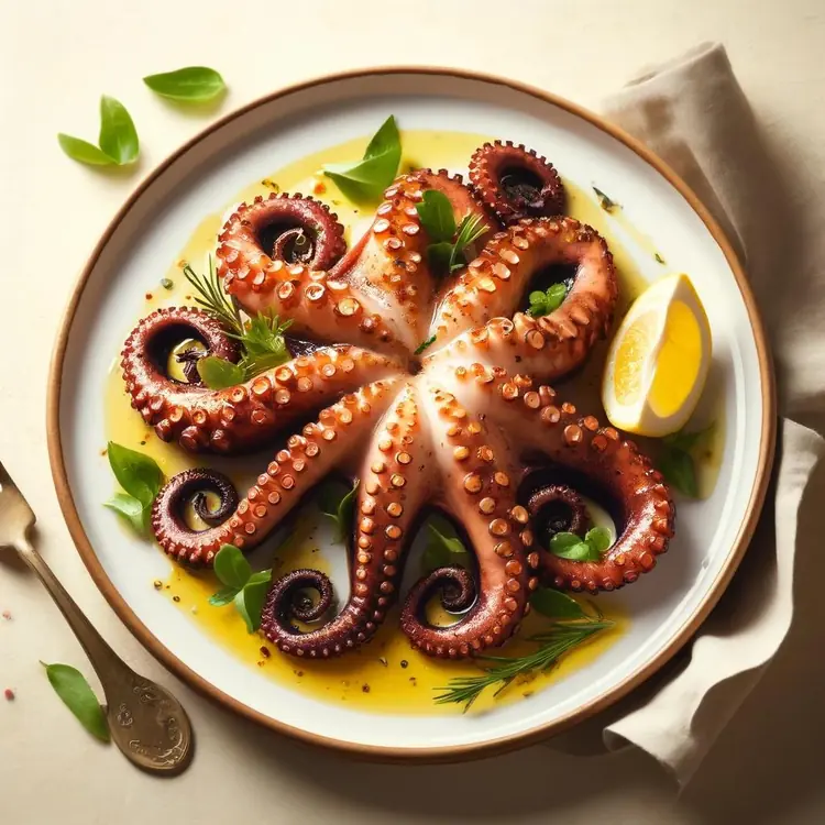 Tentacoli di polpo cotti alla griglia e serviti con olio d'oliva, prezzemolo e aglio
