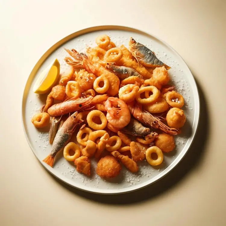 Una selezione di piccoli pesci fritti, come gamberetti, calamari e alice