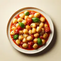 Gnocchi di patate serviti con salsa di pomodoro, mozzarella fresca e basilico.