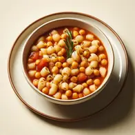 Una zuppa densa di pasta e ceci, aromatizzata con aglio, rosmarino e peperoncino.