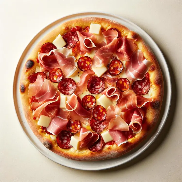 Una deliziosa pizza con una base croccante di pasta, arricchita con pomodori pelati, mozzarella filante, prosciutto crudo fragrante, rucola fresca e scaglie di Parmigiano Reggiano, il tutto condito con un filo d'olio d'oliva e una spolverata di pepe nero.